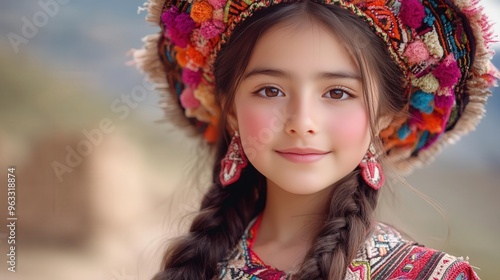 Portrait of a young girl in traditional Peruvian attire, showcasing vibrant colors and intricate patterns against a blurred background.