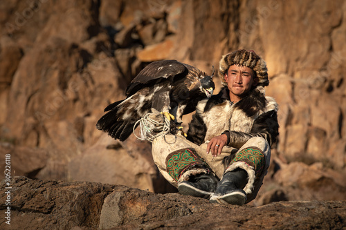 Portrait of a young kazakh eagle hunter with his majestic golden eagle in the steppe. Ulgii, Mongolia.