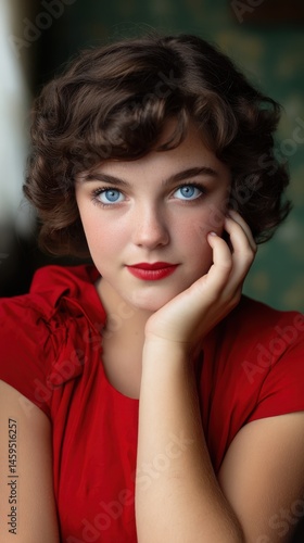 Portrait of a young woman with blue eyes and red lipstick, wearing a vibrant red dress, resting her chin on her hand, and looking at the viewer.
