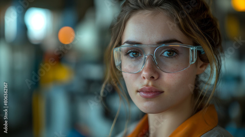 Portrait of a young woman worker in overalls and safety glasses, personal protective equipment