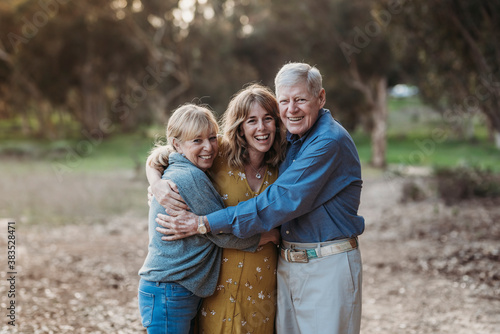Portrait of Adult Woman and Senior Parents Hugging at Park