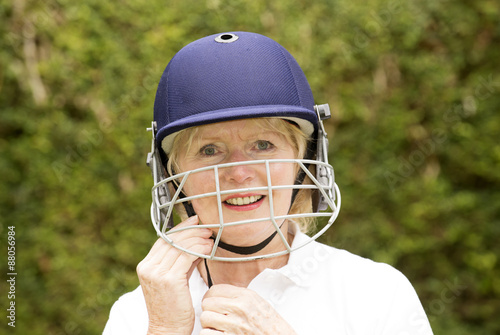 Portrait of an elderly woman cricketer wearing a batswomans' saftey helmet