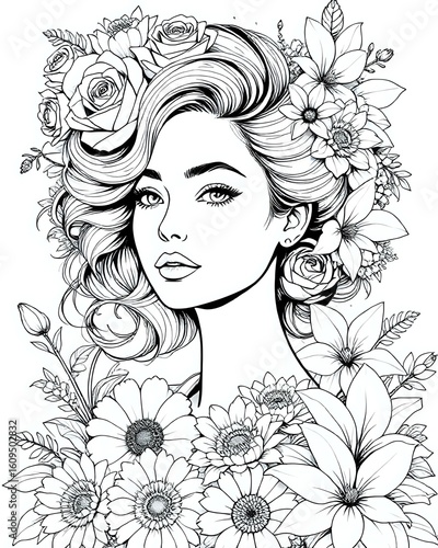 Portrait of an elegant beautiful woman surrounded by flowers, coloring page for adults, black and white flower girl coloring book for women, unique grayscale floral design for kids, pretty flowers 10