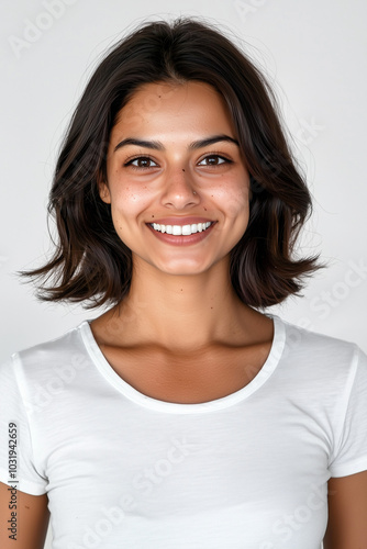 Portrait of an India woman smiling wearing a white t-shirt and with a bob cut hairstyle
