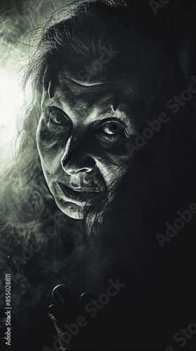 Portrait of an old woman with long hair, grim and scary face, with a scary expression surrounded by smoke against a black background creating a scary atmosphere in the style of a horror movie poster