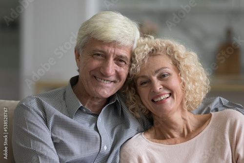 Portrait of attractive optimistic older spouses, close up shot. Happy marriage, harmonic relationships, homeowners loving couple with wide toothy smile staring at camera posing at modern home. Love
