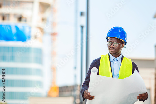 Portrait of attractive unshaven architect in suit with helmet on head walking around building in construction process and using tablet. Portrait of professional architect wearing blue helmet