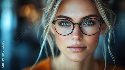 Portrait of beautiful blond woman with bright blue eyes wearing glasses demonstrating balance of style and intelligence