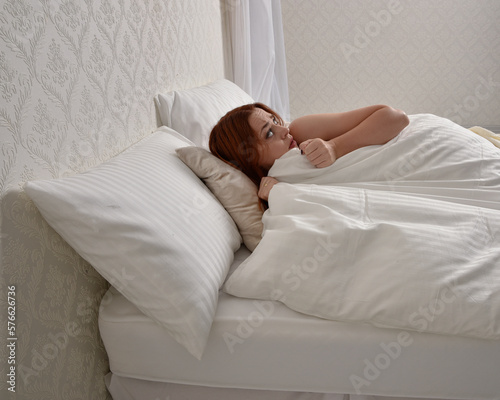 Portrait of beautiful red haired woman wearing comfortable pyjamas, casualy resting in bed, getting ready for sleep, in a glamorous white bedroom location background.