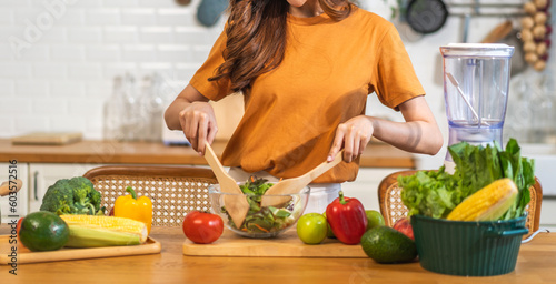 Portrait of beauty body slim healthy asian woman having fun cooking and preparing cooking vegan food healthy eat with fresh vegetable salad in kitchen at home.Diet concept.Fitness, wellness, healthy