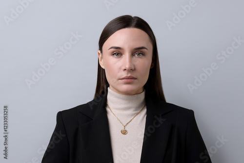 Portrait of businesswoman on light grey background