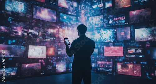 Portrait of Caucasian Man Using Smartphone in Metaverse With Animated Stream Of Interfaces With Social Media, e-Commerce Shopping, Internet Influencers And Games. Visualization Of Web Network.