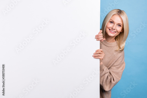 Portrait of cheerful aged person behind huge empty space ad blank isolated on blue color background