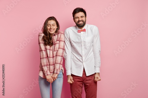 Portrait of cheerful female and male clench fists, close eyes from pleasure, satisfied with good results of common work, wear fashionable shirts, isolated over pink background, spend great time