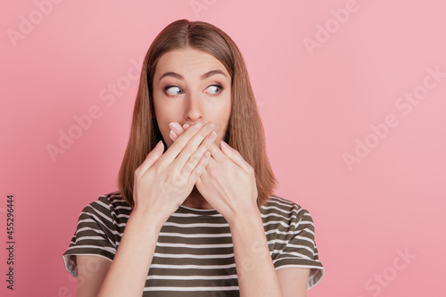 Portrait of crazy speechless silent lady hands hide mouth look side blank space on pink background
