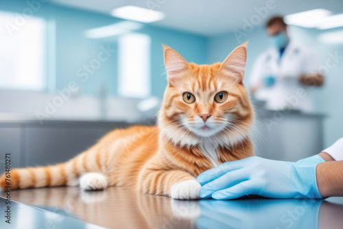 Portrait of cute ginger cat on a table at vet clinic. Veterinarian doctor hands in blue gloves holds and examining animal. Pet check-up, vaccination, health care. Veterinary medicine concept.