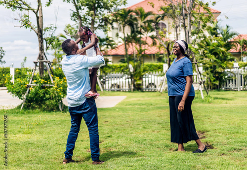 Portrait of enjoy happy love black family african american father and mother with little african girl child smiling and play having fun moments good time in room at home