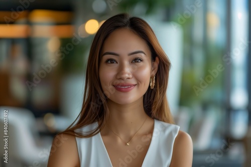 Portrait of filipina woman beautiful business leader, in modern bright office boardroom, professional atmosphere, leadership, diverse workplace, corporate setting.
