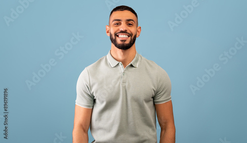 Portrait of happy arabic guy smiling at camera over blue studio background, copy space. Handsome middle-eastern young man in casual showing positive emotions