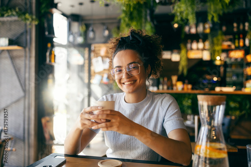 Portrait of happy girl sitting in coffee shop with coffee in her hands and smiling at camera.