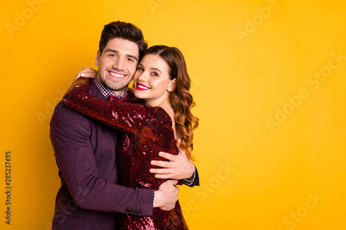 Portrait of his he her she nice-looking attractive lovely lovable smart charming sweet cheerful cheery people cuddling spending celebratory time isolated over bright vivid shine yellow background