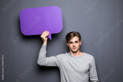 Portrait of Man holding purple blank speech bubble with space for text