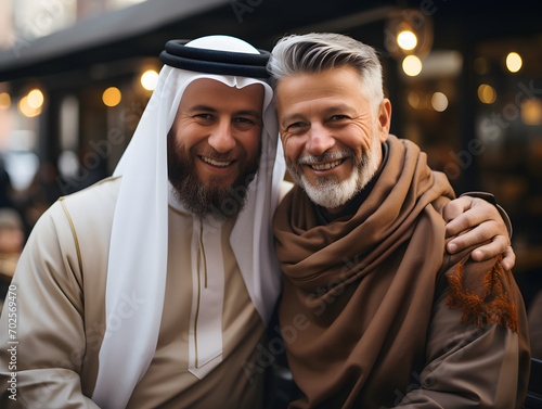 Portrait of Muslim Imam and Christian Priest Embracing Each Other