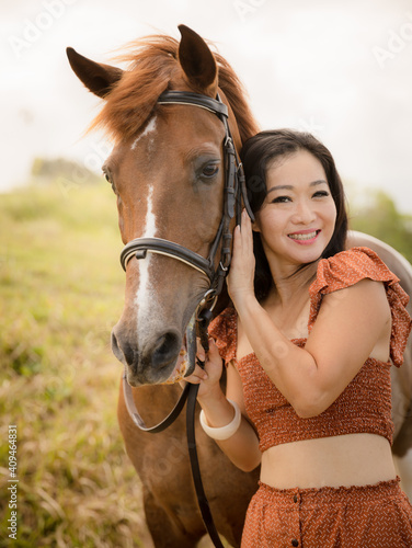 Portrait of smiling woman and brown horse. Asian woman hugging horse. Romantic concept. Positive emotions. Love to animals. Nature concept. Bali