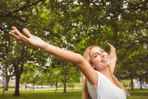 Portrait of smiling woman with arms raised in park