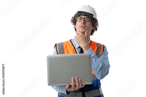Portrait of Smiling young business man wearing orange vest and white helmet using computer laptop