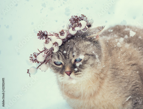 Portrait of the cute Siamese kitten in a Christmas wreath. A cat walks through the snow in winter
