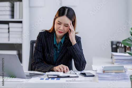Portrait of tired business asian woman sitting at a work. documents tax laptop computer in office. Sad, unhappy, Worried, Depression, or overworked, failure employee life stress concept