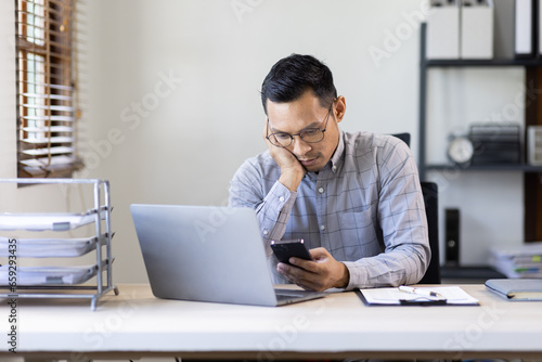 Portrait of tired young business Asian man work on phone with documents tax laptop computer in office. Sad, unhappy, Worried, Depression, or employee life stress concept