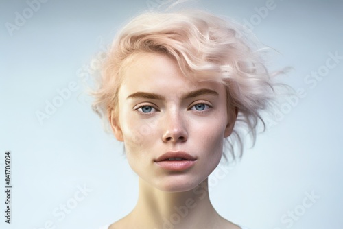 Portrait of white woman dressed in white on light background