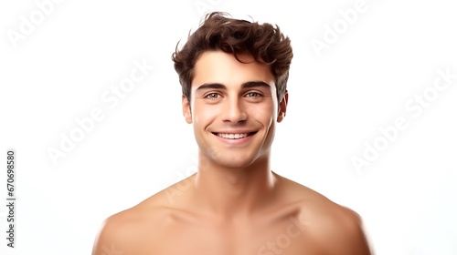 Portrait of young happy man looks in camera. Skin care beauty, skincare cosmetics, dental concept isolated over white background
