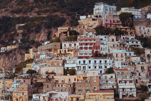Positano Italy landscape blue sea background, colorful flowers, cloudy sky little village romantic atmosphere nature sunlight sunrise and sunset path of gods Amalfi coast view panorama