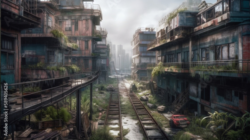 Post-apocalyptic ruined city. Destroyed buildings, burnt-out vehicles and ruined roads