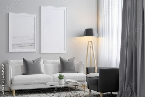 Poster frame mockup interior design in light soft colors, white sofa. AI generated.