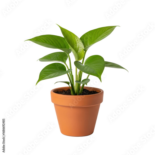 Potted houseplant with green leaves in a terracotta pot on a white background.