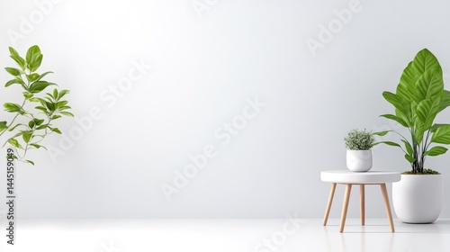 Potted plants on a white side table in a minimalist room, lush green foliage against a plain white wall, and modern interior design concept.