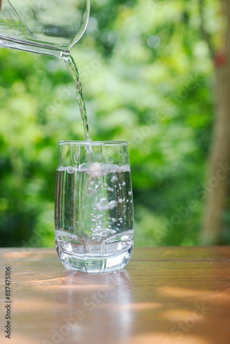 pouring drinking water in to clear glass on wooden table in garden background.