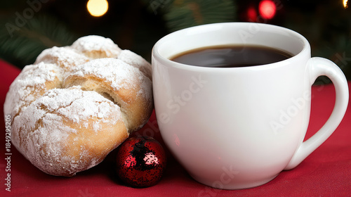 Powdered roll and coffee cup on red table with festive lights