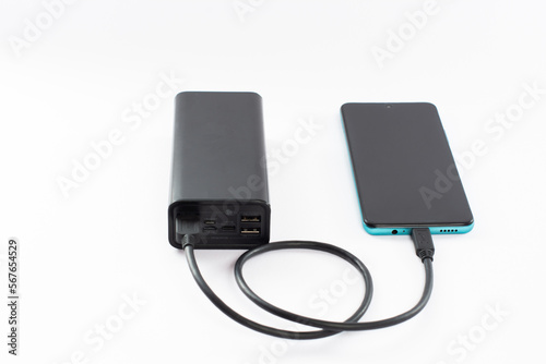 power bank with charging cable and phone, copy space and white background.