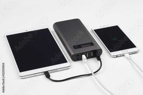 Powerbank charging tablet and smart phone.
