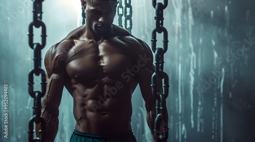 Powerful Bodybuilder Training Amidst Chains and Dramatic Lighting