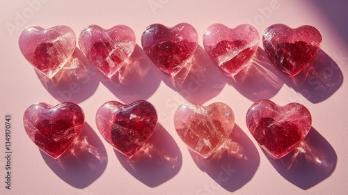 Precious gem-like heart crystals arranged symmetrically, shimmering with soft light, vibrant red hue on a smooth pink background