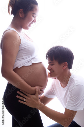 Pregnancy Joy. Happy Asian Couple Hugging