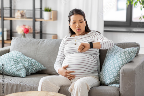 pregnancy, rest, people and expectation concept - pregnant asian woman with smart watch having labor contractions sitting on sofa at home and breathing