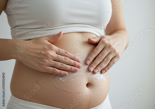 Pregnant Belly with Stretch Mark Cream, Maternity Belly Skincare, Applying Cream on Pregnancy Stretch Marks, Korean Pregnant Woman Using Stretch Mark Cream, Belly Care for Expecting Mom
