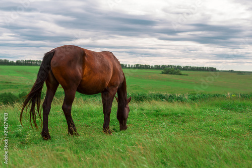 Pregnant brown horse grazing in field
